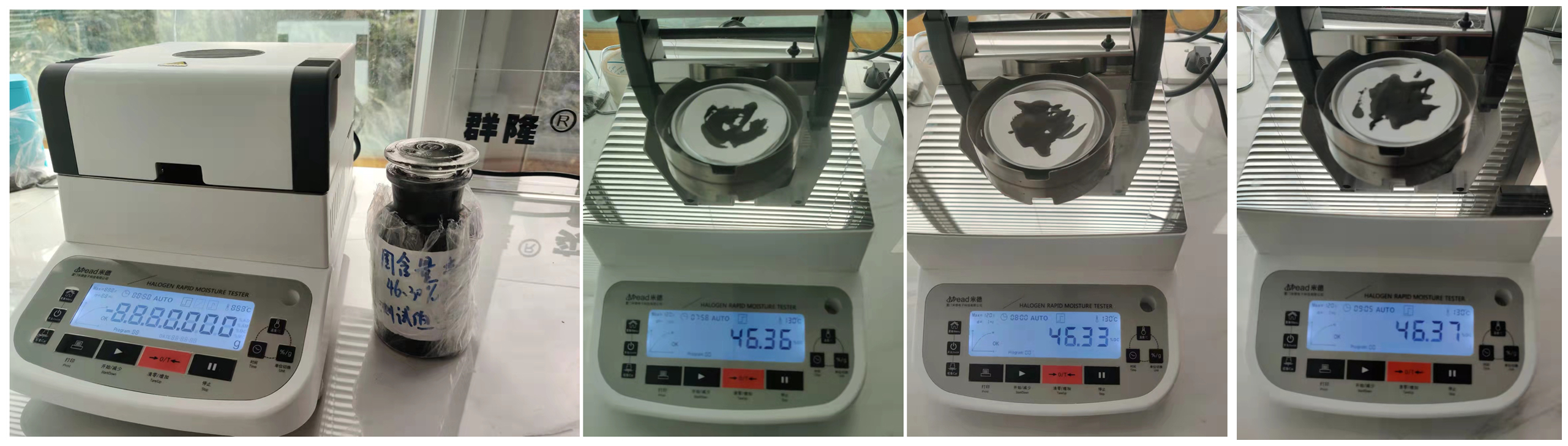 - 復位儀器,待儀器冷卻至40℃以下后,再取等量的漿料均勻涂在玻璃纖維紙上,重復上述測試步驟;測試結束后得出第二組數據,顯示樣品的固含量為46.33%;第三組數據,固含量為46.37%;根據客戶提供的參考數據46.30%,實際測試誤差小于客戶給出的誤差±0.5%,表示測試結果可靠,可重復性好。