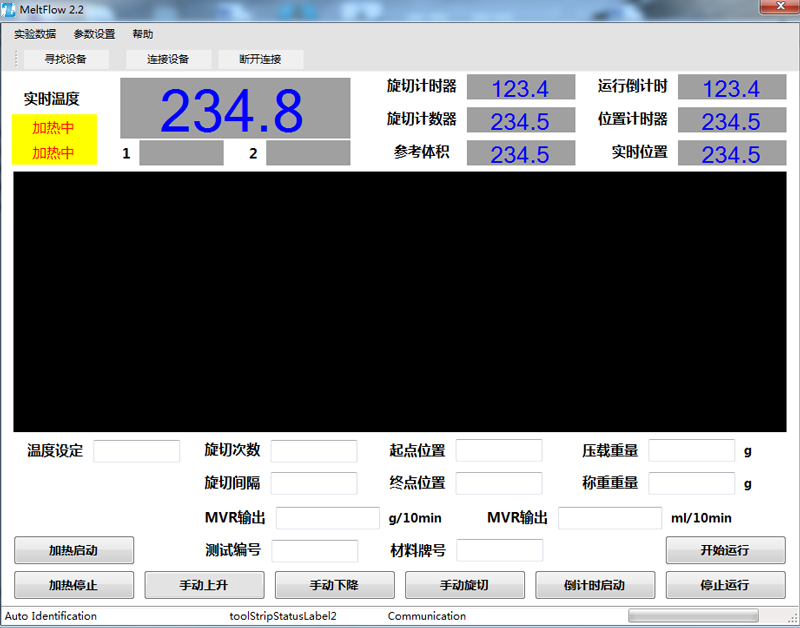 • 測試時可選擇質量法,或體積法,或兩種測試方法同時進行,并可計算熔融密度。兩種方法均為活塞桿移動到某位置時開始測試。