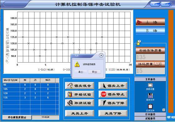 試驗(yàn)開(kāi)始時(shí),首先選擇試驗(yàn)方法,估計(jì)一個(gè)初始質(zhì)量和Δm值,進(jìn)行試驗(yàn),如果第一個(gè)試樣破損,用砝碼Δm減少落體質(zhì)量;如果第一個(gè)試樣不破,須用砝碼Δm增加落體質(zhì)量依此進(jìn)行試驗(yàn)。總之,利用砝碼減少或增加落體質(zhì)量,取決于前一個(gè)試樣是否破損。20個(gè)試樣試驗(yàn)后,計(jì)算破損總數(shù)N,如果N等于10,試驗(yàn)完成;如果N小于10,補(bǔ)充試樣后,繼續(xù)試驗(yàn)直到N等于10;如果N大于10,補(bǔ)充試樣后,繼續(xù)試驗(yàn)直到不破損的總數(shù)等于10為止,最后由系統(tǒng)自動(dòng)計(jì)算沖擊結(jié)果。